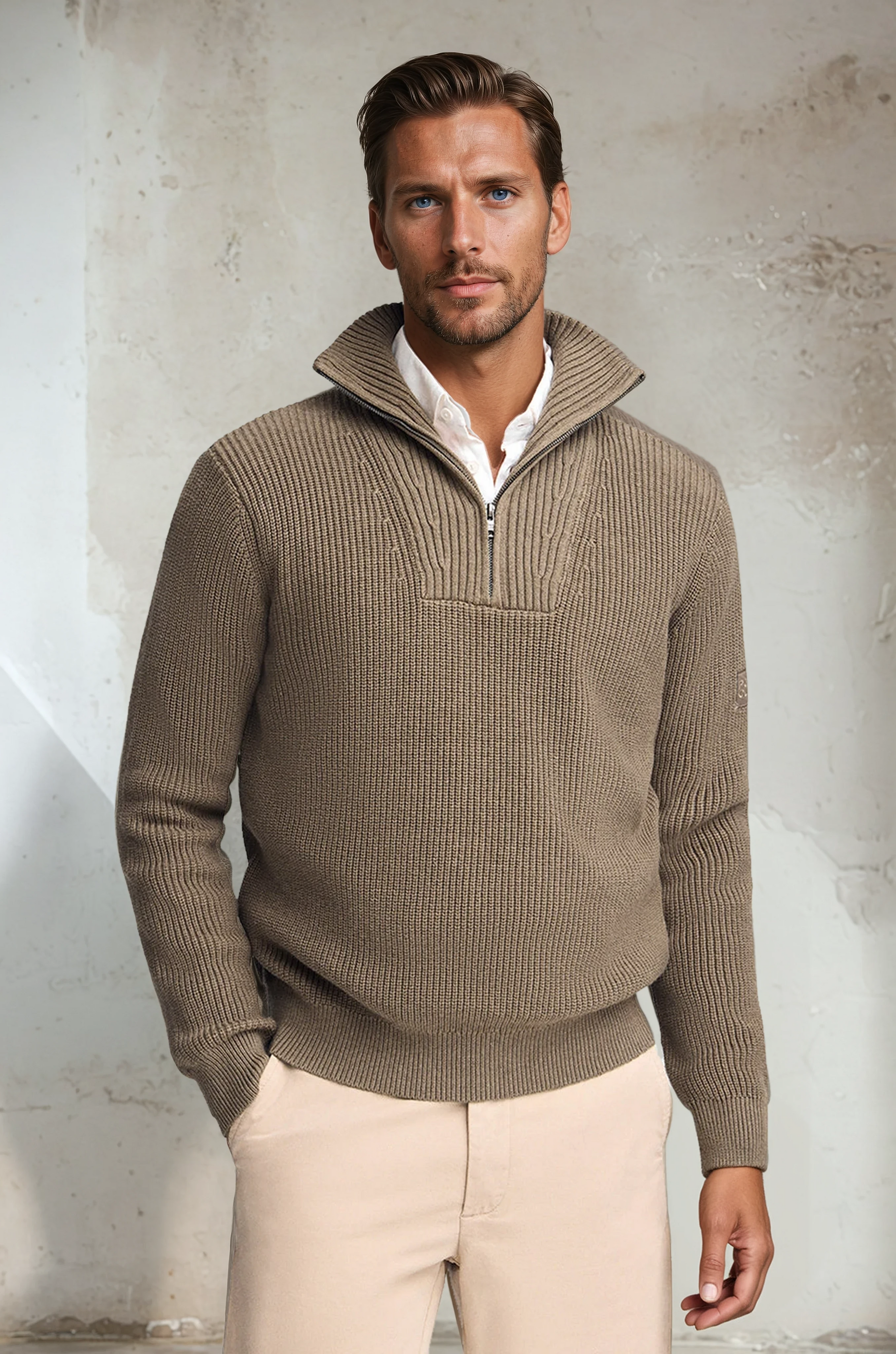 Varello™ Luxe Half-Zip Knit – Taupe Gestreepte Trui met Korte Halsrits